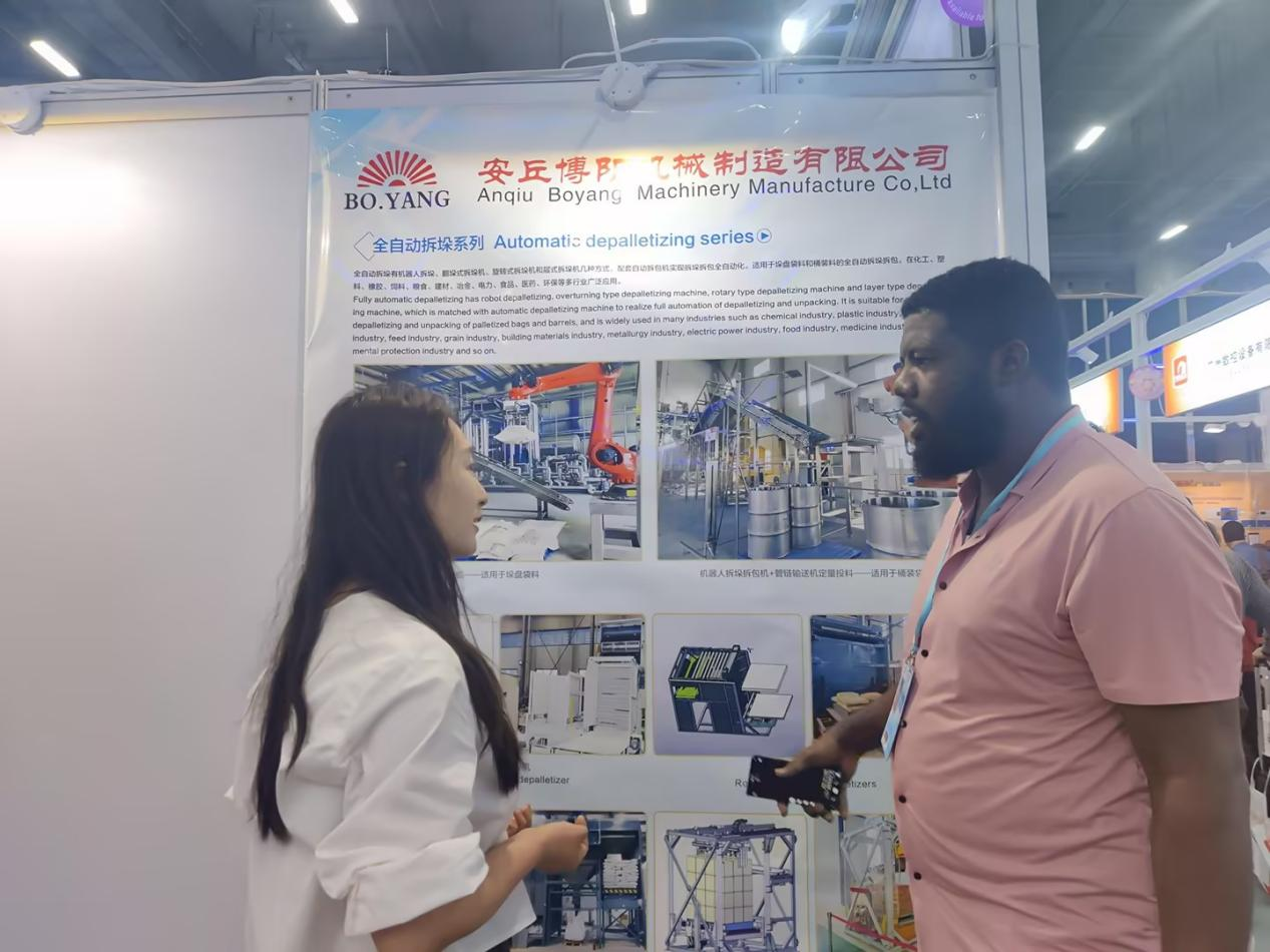 其中一位馬來西亞籍客戶非常認可展出的全自動裝車機,在對產(chǎn)品進行了全面、詳細了解后,感到“豁然開朗”,真是“踏破鐵鞋無覓處,得來全不費工夫”,他表示博陽公司產(chǎn)品解決了他多年的設(shè)備采購難題。目前,已現(xiàn)場達成合作意向500多萬美元。