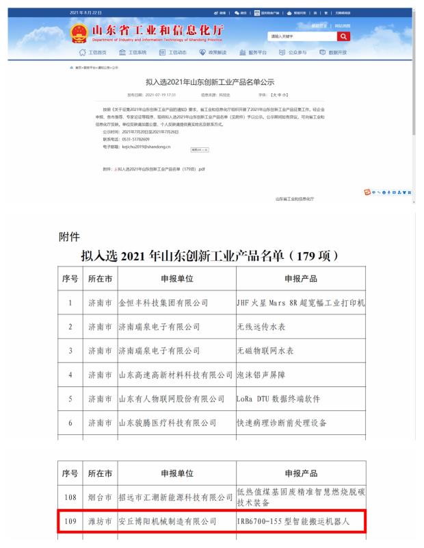 祝賀安丘博陽機(jī)械制造有限公司入圍“山東民營(yíng)企業(yè)創(chuàng)新潛力100強(qiáng)”,安丘博陽機(jī)械制造有限公司的申報(bào)產(chǎn)品“IRB6700-155型智能搬運(yùn)機(jī)器人”擬入選2021年山東創(chuàng)新工業(yè)產(chǎn)品名單。